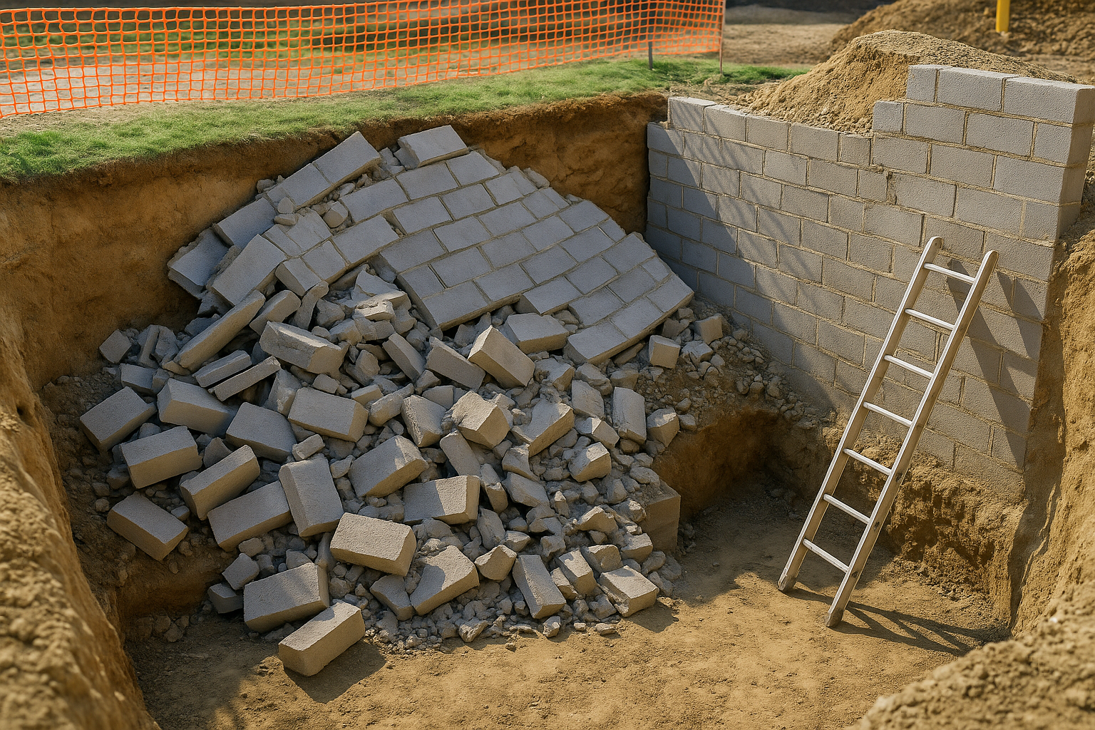 – Collapse caused by premature back-filling of wall.