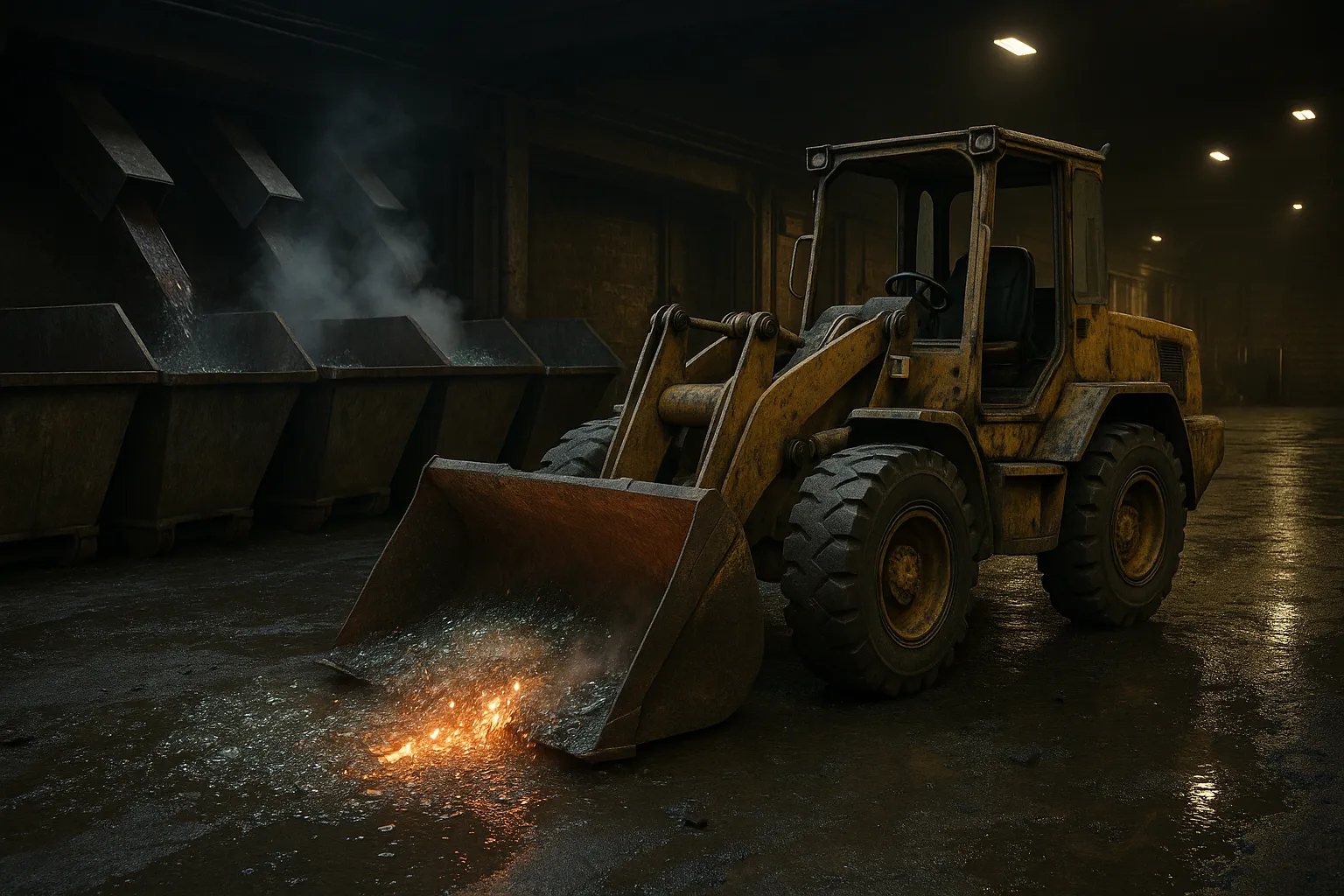 On the day of the incident, the worker was using a shovel loader to clear spilled molten glass and hot water. However, due to the absence of a protective door on the loader’s cab—missing since March 2022 after being damaged—some of the material spilled onto him.